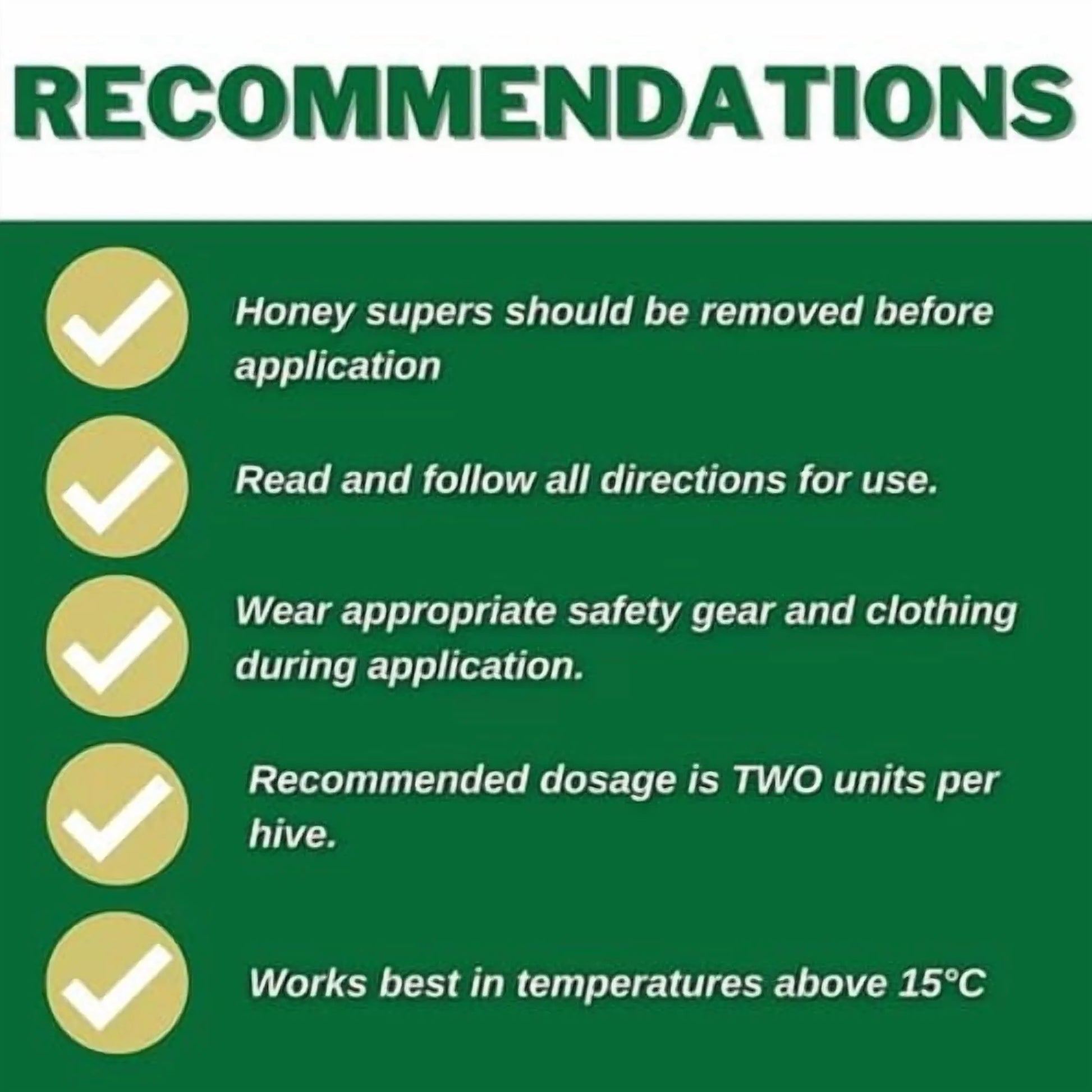 - Do not use during honey flow: This treatment is best applied after a honey harvest to avoid contamination of honey.